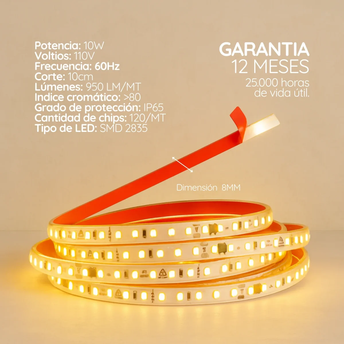 La cinta LED super slim es una cinta de luz LED ultradelgada, con 8 mm de ancho, está diseñada para integrarse de forma discreta en proyectos arquitectónicos con espacios reducidos. Funciona directamente a 110 V, consume 9 W por metro y permite tramos de hasta 20 metros lineales sin caída de voltaje. Es ideal para detalles de luz continua en mobiliario, repisas, cenefas o trazos arquitectónicos limpios.