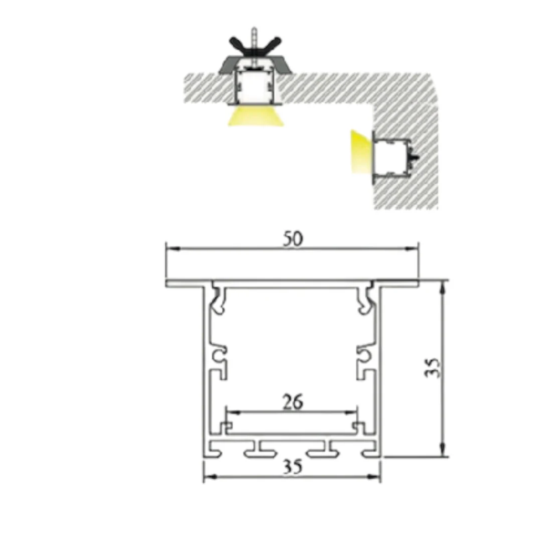 El perfil de aluminio 3535A de incrustar está diseñado para instalaciones de cinta LED o regletas LED en techos, ofreciendo una iluminación lineal elegante y uniforme. Su tamaño y diseño permiten la colocación de dos líneas de cinta LED para lograr mayor luminosidad, ideal para oficinas, locales comerciales, cocinas, bares y proyectos de iluminación arquitectónica.
