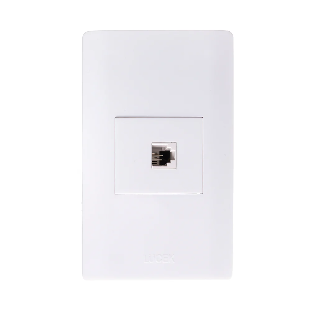 Placa de 1.5 módulos blanca con una toma telefónica de 1.5 módulos. Fácil de instalar.