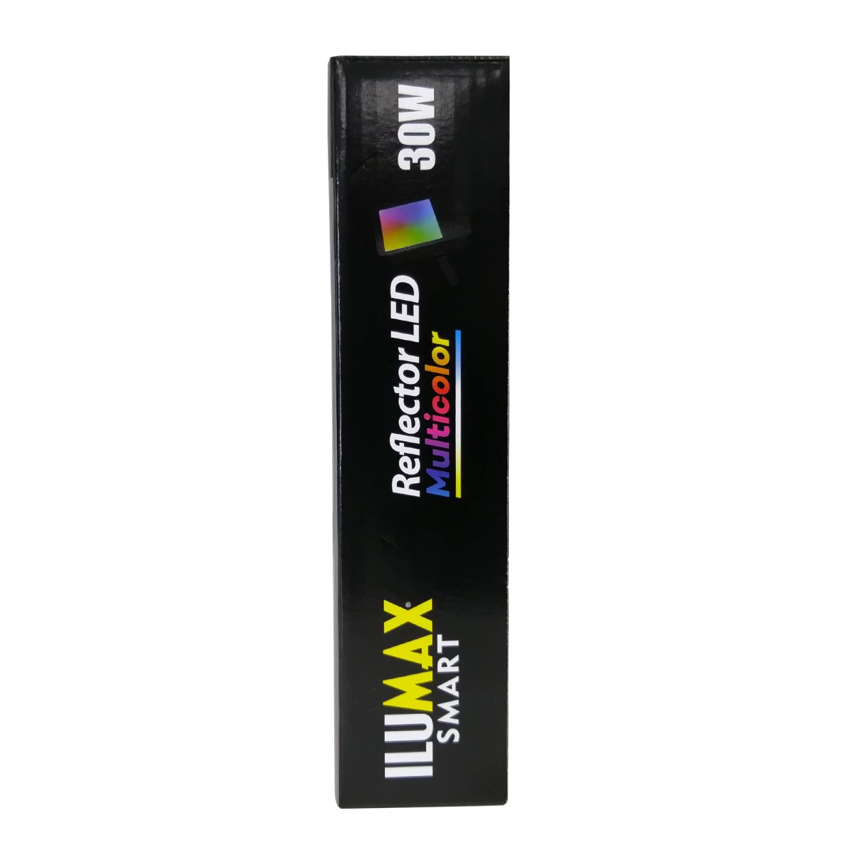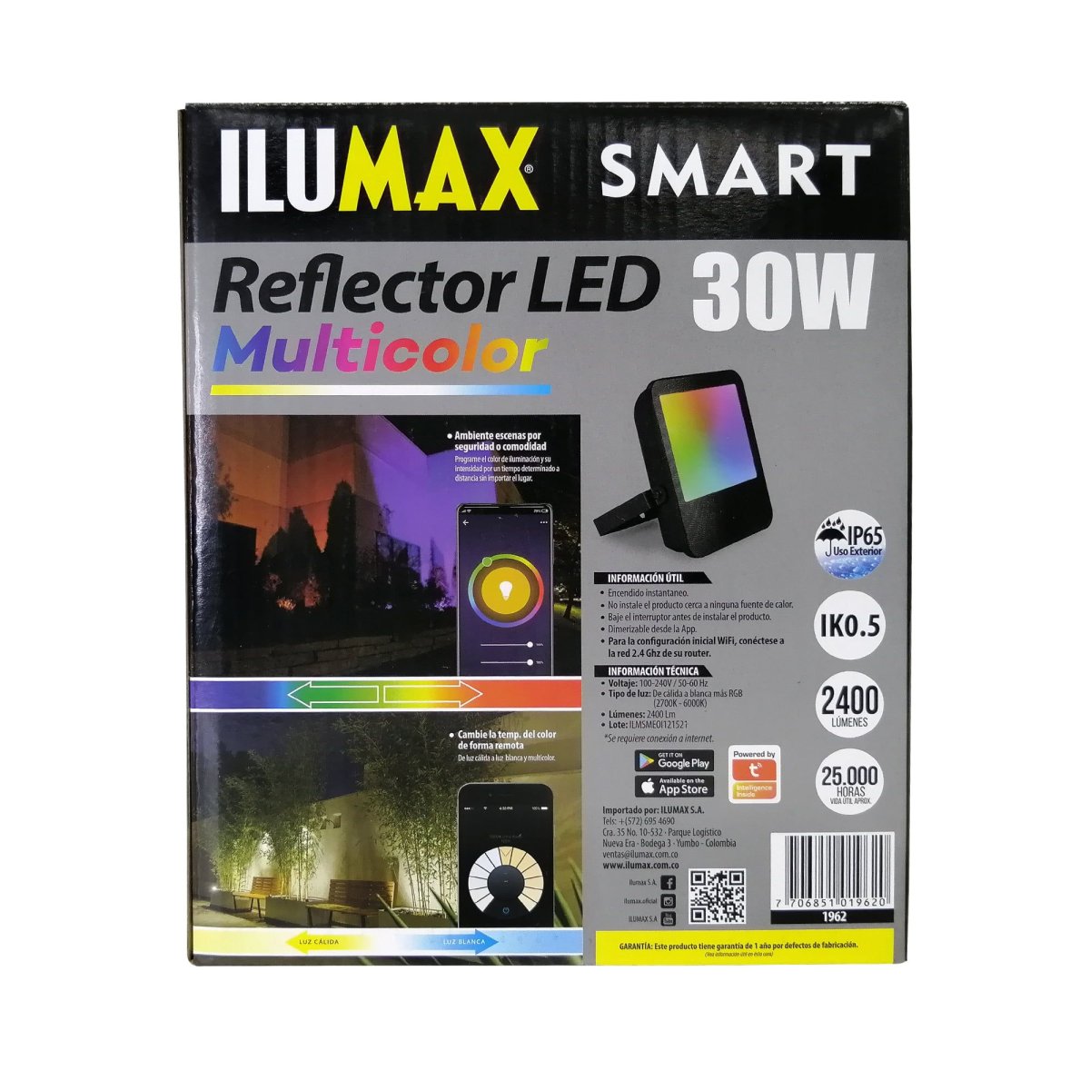 Reflector LED inteligente 30W encendido, control de color de luz y temporizador por medio de la aplicación móvil Amazon Alexa, Tuya smart, google home etc, conexión wifi requiere router con soporte 2.4GHz, tipos de luz color amarillo 2700K a blanco 6000K o multicolor RGB, voltaje 100 a 240V, vida útil 25000 horas, ángulo de apertura 120° y grado de protección IP65.